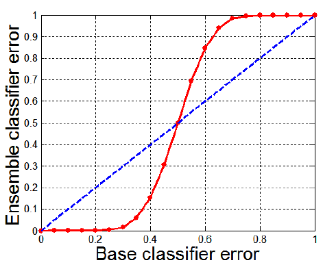 각 분류기의 error rate가 꽤 높지만, 앙상블 분류기가 잘못된 분류를 내릴 확률은 6%정도로 매우 낮다.