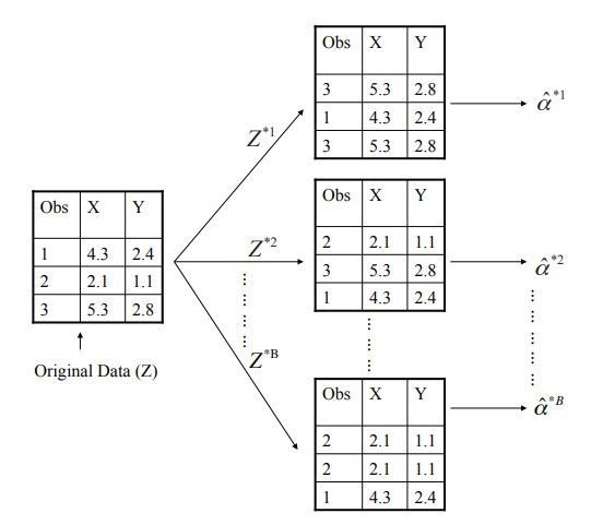 bootstrap sample에는 어떤 $X_i$는 여러번 등장할 수 있고 어떤 $X_j$는 한개도 없을 수 있다.