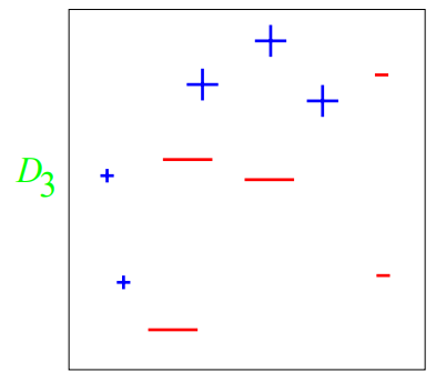 [Round 3] 세번째 분류기($h_3$)가 다음과 같이 분류했다고 하자. 3개의 인스턴스가 잘못 분류되었다. 따라서 잘못 분류된 3개의 weight를 더하여 error rate를 구한다. $\epsilon_3 = 0.14$ 이어서 $\alpha_3$를 구하면 $\alpha_3 =\frac{1}{2}\ln \frac{1-0.14}{0.14} = \frac{1}{2} (1.81) \approx 0.92$ |