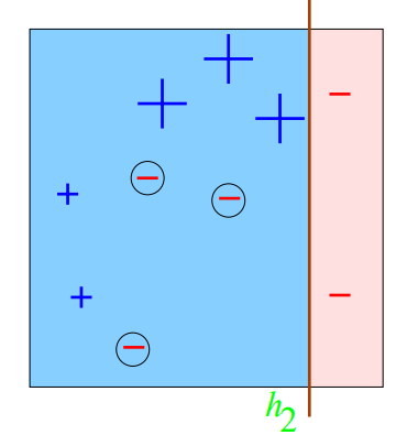 [Round 2] 두번째 분류기($h_2$)가 다음과 같이 분류했다고 하자. 3개의 인스턴스가 잘못 분류되었다. 따라서 잘못 분류된 3개의 weight를 더하여 error rate를 구한다. $\epsilon_2 = 0.07 + 0.07 + 0.07 = 0.21$ 이어서 $\alpha_2$를 구하면 $\alpha_2 = \frac{1}{2}\ln \frac{1-0.21}{0.21} = \frac{1}{2} (1.32) \approx 0.65$ |