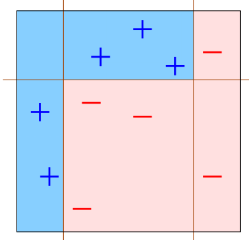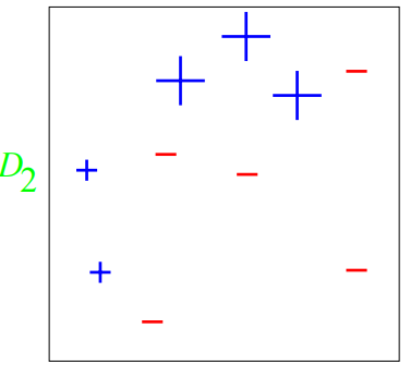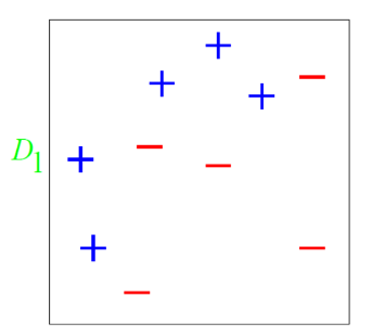 10개의 인스턴스가 있고, 5개의 (+)와 5개의 (-)를 분류해보자. 처음 $D_1$은 모든 튜플 $(\mathbf{X}_i, y_i)$의 weight는 균일하다. $w_1 = [\frac{1}{10}, \dots, \frac{1}{10}]$ |