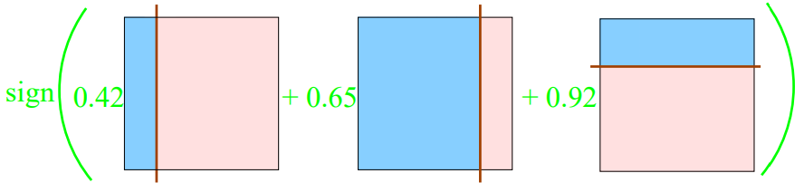 [Final Hypotheis] 각 label (1, -1)에 맞게 partition마다 부호를 곱하고, max voting을 통해 최종 label을 예측한다. 예를 들어 6개의 파티션 중 2번째 파티션(12시 방향)의 경우, $-0.42+0.65+0.92>0$이므로 (+)로 예측한다. 또 4번째 파티션(6시 방향)의 경우, $-0.42+0.65-0.92 < 0$이므로 (-)로 예측한다. |